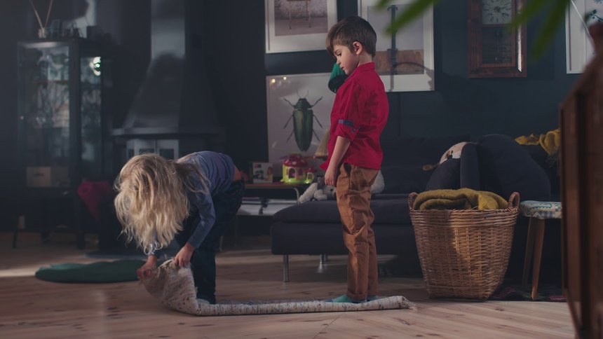 Lägg ut olika föremål på golvet, exempelvis kuddar och leksaker, så att det bildar en “hinderbana”. Låt sedan barnen gå baklänges och parera eller kliva över föremålen längs banan.