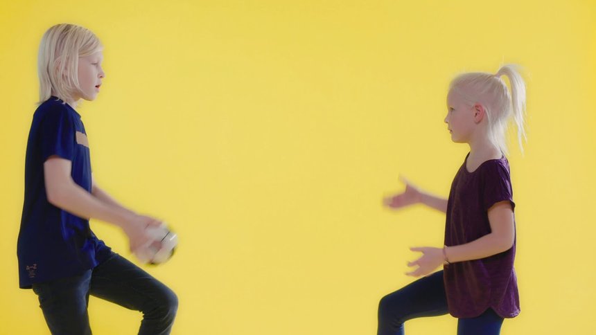 Stå på ett ben och kasta en ärtpåse eller en boll mellan varandra. Öka svårighetsgraden genom att hoppa samtidigt.