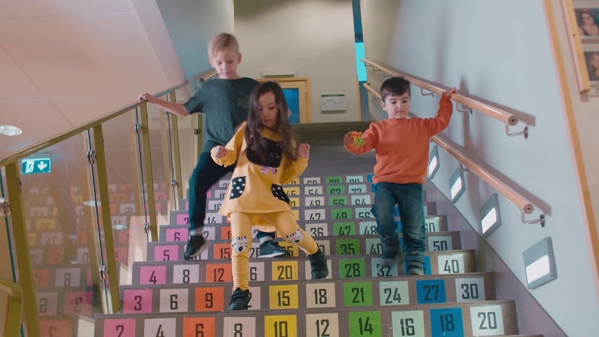 Gå upp och ner i en trappa utan att ta stöd med händerna. Öka svårighetsgraden genom att hoppa på ett eller två ben, alternativt genom att gå baklänges upp och ner. En annan utmaning är att transportera olika föremål upp och ner för trappan.